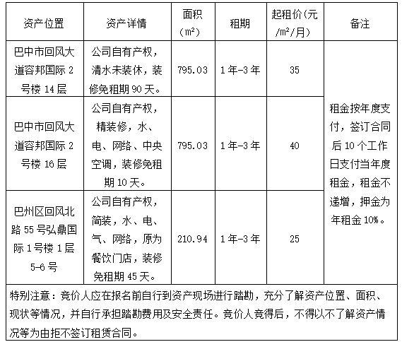 根據(jù)國(guó)有資產(chǎn)管理相關(guān)規(guī)定,巴中自然資源投資集團(tuán)有限公司決定對(duì)相關(guān)資產(chǎn)進(jìn)行公開(kāi)招租?,F(xiàn)將有關(guān)事項(xiàng)公告如下: